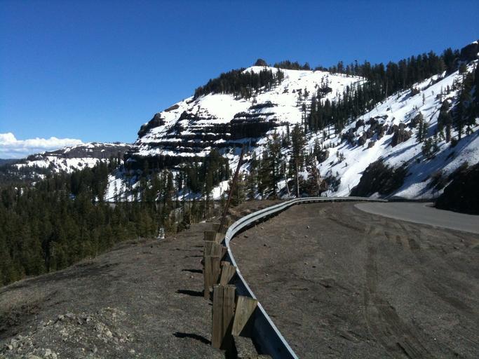 Keywords: safety fence guard railing crash barrier curb road landscape trees mountains