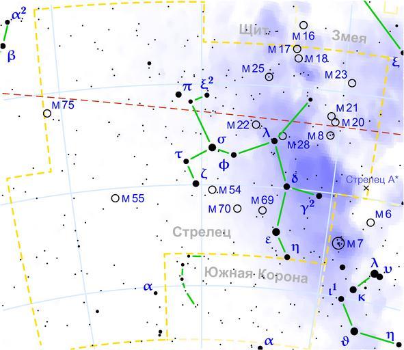 | Keywords: Sagittarius constellation map ru lite.png en Sagittarius constellation map in Russian ru Ка та созвездия Ст ельца на усском языке It was created using the programs PP3 Miktex 2 5 GhostScript and Gimp At http //pp3 sourceforge net PP3's homepage you also get the input scripts necessary for re-compiling the map The yellow dashed lines are constellation boundaries the red dashed line is the ecliptic and the shades of blue show Milky Way areas of different brightness The map contains all Messier objects except for colliding ones The underlying database contains all stars brighter than 6 5 All coordinates refer to equinox 2000 0 The map is calculated with the equidistant azimuthal projection the zenith being in the center of the image The north pole is to the top The horizontal lines of equal declination are drawn for 0° +10° +20° etc The lines of equal rectascension are drawn for all 24 hours Towards the rim there is a very slight magnification and distortion own 2007-02-19 Anton Gutsunaev Constellations maps russian |