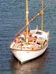 Keywords: sailing boat for anchor luck relaxation rest quiet sunny sunbathing joy summer vacation relax holiday friendship cooling peaceful mediterranean sea spain