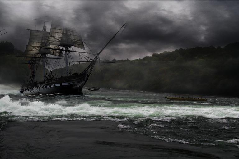 Keywords: sailing ship rushing water river ship vessel sailboat shore transport sail bad weather landscape transportation shipping ship-to-shore nautical wooden digital composing fantasy clouds fog dramatic scene scenery