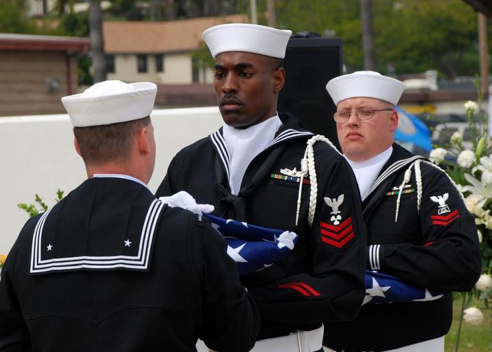 Keywords: Sailors honor deceased submarine veteran DVIDS99684.jpg en Petty Officer 1st Class Antonio Shelly left and Petty Officer 2nd Class Seth Gibson prepare to present the ceremonial flag to the children of retired Cmdr Joseph L McGrievy during a memorial service held at Naval Base Point Loma Cmdr McGrievy was a recipient of the Silver Star and a 30-year submarine veteran who made 11 successful war patrols during World War II 2008-03-12 Chief Petty Officer Yan Kennon https //www dvidshub net/image/99684 080312-N-+++++-200 2008-07-02 21 32 SAN DIEGO CA US PD-USGov-Military-Navy Naval Base Point Loma Images from DoD uploaded by Fæ |