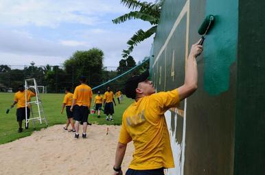 Keywords: Sailors and Marines play football with children in Thailand 110504-N-IC111-517.jpg en Sailors and Marines assigned to the aircraft carrier USS Ronald Reagan paint the Youth Football Home practice walls during a community service project Ronald Reagan is currently anchored in Makham Bay Thailand for a scheduled port visit Photo by Petty Officer 3rd Class Kevin B Gray 2011-05-04 Kevin Gray https //www dvidshub net/image/397705 110504-N-IC111-517 2011-05-05 01 04 THALANG PHUKET TH PD-USGov-Military-Navy USS Ronald Reagan CVN-76 Images from DoD uploaded by Fæ |