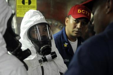 | Keywords: Sailors practice damage control techniques DVIDS214888.jpg en Damage control training team members train Petty Officer 3rd Class Jonetta McCoy a flying squad team member during a toxic gas drill aboard the amphibious command ship USS Blue Ridge Blue Ridge is the flagship for the U S 7th Fleet 2009-10-17 Petty Officer 3rd Class Daniel Viramontes https //www dvidshub net/image/214888 091017-N-+++++-181 2009-10-20 12 19 USPACOM AT SEA PD-USGov-Military-Navy USS Blue Ridge LCC-19 Images from DoD uploaded by Fæ |