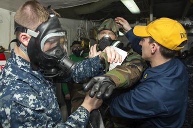 Keywords: Sailors put on personal protective gear during a CBR drill. (8577550374).jpg RED SEA March 19 2013 Aviation Electronics Technician 3rd Class Jonathan S Hill and Chief Aviation Electronics Technician Byron D Tims help Aviation Electronics Technician 3rd Class Matthew A Beanblossom put on his personal protective equipment and MC2P gas mask during a chemical biological and radiological general quarters drill aboard the aircraft carrier USS Dwight D Eisenhower CVN 69 Dwight D Eisenhower is deployed to the U S 5th Fleet area of responsibility promoting maritime security operations theater security cooperation efforts and support missions as part of Operation Enduring Freedom U S Navy photo by Mass Communication Specialist Seaman Andrew Schneider/Released 130319-N-XQ474-043 Join the conversation http //www facebook com/USNavy www facebook com/USNavy http //www twitter com/USNavy www twitter com/USNavy http //navylive dodlive mil navylive dodlive mil https //www flickr com/photos/usnavy/8577550374/ Sailors put on personal protective gear during a CBR drill 2013-03-19 06 32 https //www flickr com/people/56594044 N06 Official U S Navy Page from United States of America PD-USNavy Official U S Navy Imagery https //flickr com/photos/56594044 N06/8577550374 2016-12-14 04 41 09 United States Government Work Naval ships of the United States Files from the U S Navy Flickr stream Files uploaded by Reguyla People of the United States Navy |