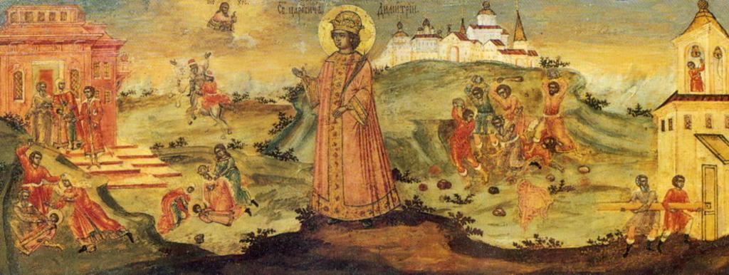 | Keywords: Saint Dmitriy icon 02.jpg ru Ца евич Димит ий Угличский Житие Иконог афическая сп авка Слева 1 Ца евича выводят из дво ца 2 Убиение ца евица ко милица пытается спасти Димит ия 3 Битяговские на лошадях пытаются бежать из Углича Сп ава 1 Понома ь бьет в колокол Битяговские пытаются выбить две ь в колокольне 2 Жители Углича побивают камнями убийц Димит ия 3 Г ад Углич XVIII век http //lib pstgu ru/icons/index php option com_content view article id 191740009 191740009 catid 4 2009-11-26-12-53-12 lib pstgu ru Creator Ф агмент Понома ь бьет в колокол Битяговские пытаются выбить две ь в колокольне custom PD-Art Tsarevitch Dmitriy in icons 03 Death of Tsarevich Dmitry |