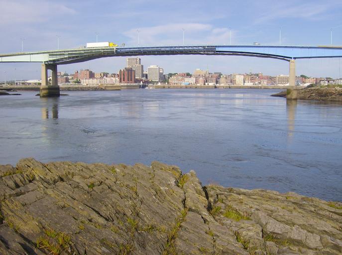Keywords: saint john new brunswick sky clouds bridge bay harbor water buildings skyline city cities town urban architecture vehicles reflections nature outside summer spring