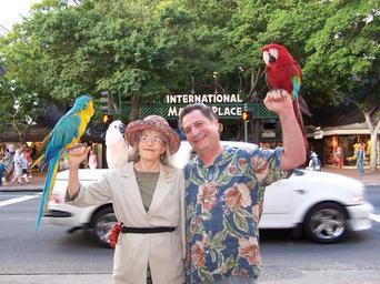 Keywords: Sal and Sharon Maccarone.JPG en Sal and Sharon Maccarone with parrots outside International Market Place Kalakaua Avenue Honolulu Hawaii USA There is a Blue-and-yellow Macaw Ara ararauna on the left a Red-and-green Macaw Ara chloropterus on the right and a Salmon-crested Cockatoo Cacatua moluccensis perching on the woman's shoulder own Faukina 2006-10-11 People with Psittaciformes Ara ararauna captive Ara chloropterus captive Cacatua moluccensis in zoos |