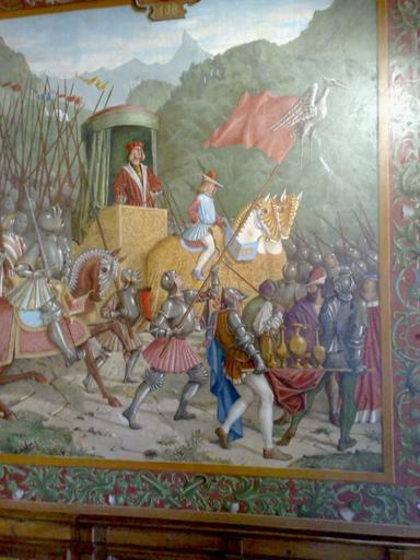 Keywords: Salle des chevaliers Castle of Gruyères.jpg Salle des chevaliers château de gruyères fresque représentant Gruerius le fondateur légendaire de Gruyères capturant une grue animal héraldique des comtes de Gruyères Own fresque 1852-1862 - Photographie March 2008 Fresque Barthélemy Menn 1815-1893 - Photographie SalomonCeb PD-art Musée du Château de Gruyères Barthélemy Menn |