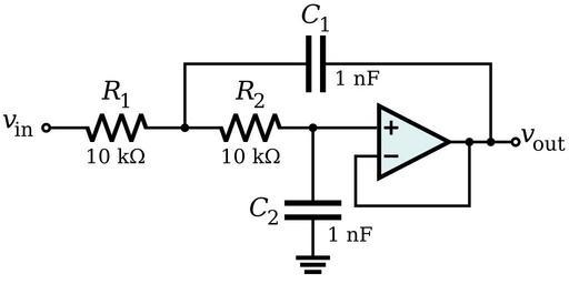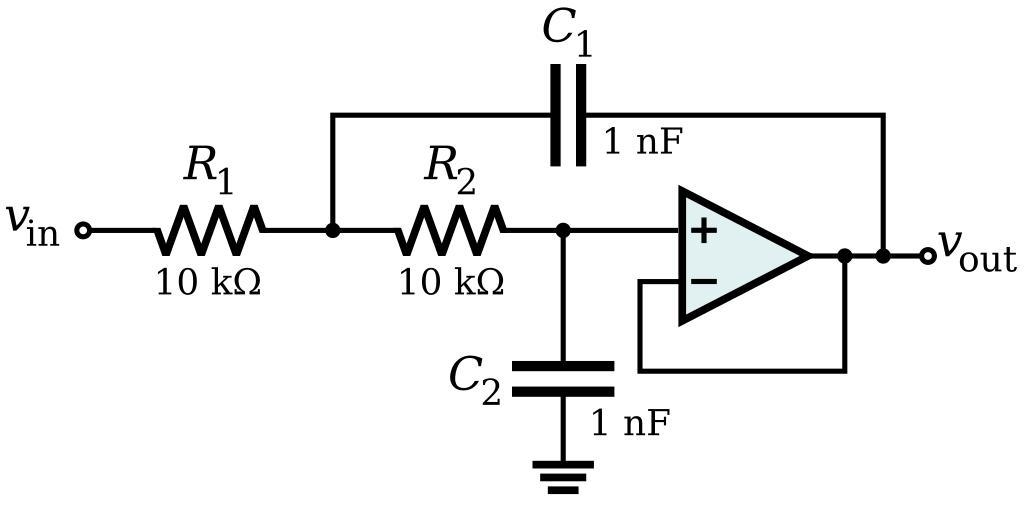 Keywords: Sallen-Key Lowpass Example.svg en A specific example of a Sallen-Key low-pass filter This filter has Q 0 5 and f<sub>c</sub> 15 9 kHz Own Inductiveload 2009-01-25 Sallen-Key filters