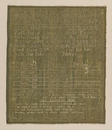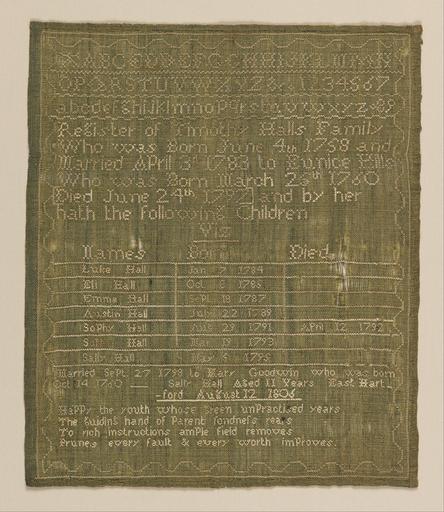 Keywords: Sally Hall - Sampler - Google Art Project.jpg Sally 6851311 Hall /collection/cooper-hewitt-national-design-museum/artwork/sampler-sally-hall/6835353/ 176719 Sally Hall /artist/sall-hall-stanford/12692374/ 12692374 /collection/cooper-hewitt-national-design-museum/ Cooper-Hewitt National Design Museum 3644669 http //www cooperhewitt org/ /collection/cooper-hewitt-national-design-museum/artwork/sampler-sally-hall/6835353/ 1806 1806 Medium silk embroidery wool warp linen weftTechnique embroidered in cross stitch on plain weave foundation By 1934 American Art Galleries1934 - 1981 Gertrude M Oppenheimer1981 Cooper-Hewitt Museum 390 6835353 False 1806 1981-28-137 http //collection cooperhewitt org/view/objects/asitem/id/176719 Bequest of Gertrude M Oppenheimer Sampler 1800 1810 w330 x h390 cm 1806 False 0 8671875 Object sampler-sally-hall Sampler s 330 H x W 39 4 x 33 7 cm 15 1/2 x 13 1/4 in Sally Hall Aged 11 years East Hartford August 12 1806 Medium silk embroidery wool warp linen weftTechnique embroidered in cross stitch on plain weave foundation By 1934 American Art Galleries1934 - 1981 Gertrude M Oppenheimer1981 Cooper-Hewitt Museum special url_id dAFpRsXFTZAFQA PD-old-100-1923 Google Art Project works by Sally Hall Textiles in the Cooper “Hewitt Smithsonian Design Museum 1800s samplers Google Art Project works in Cooper-Hewitt Smithsonian Design Museum 1806 works |