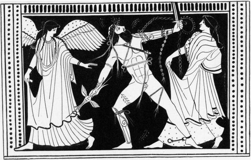 Keywords: Salmoneus AJA 1899.jpg Salmoneus wielding a sword and a thunderbolt-like thingy He just broke the chains that contained him the madman and acts like Zeus To his left is Iris to the right his astonished wife Attic red-figure column crater first half of the 5th century BC Now in the Chicago Art Institute 1889 16 This painting was first published by Ernest Arthur Gardner 1899 and attributed as Athamas in madness In 1903 Carl Robert corrected this interpretation to Salmoneus American Journal of Archaeology vol 3 1899 p 332 pl IV 1899 photo anonymous PD-old Salmoneus in ancient Greek pottery Column kraters Attic red-figure pottery 5th-century BC pottery Iris mythology Mental disorders in art |