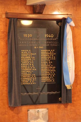 Keywords: Salonki muistotaulu Tarmo Vellamo.JPG en A memorial tablet in the saloon of icebreaker Tarmo listing the crew members who died during Winter War when a Soviet aerial bomb hit the ship on 18 1 1940 fi Sankarivainajien muistotaulu talvisodassa 18 1 1940 pommituksessa kuolleiden miehiston jäsenten muistoksi jäänmurtaja Tarmon salongissa own MKFI 2011-07-31 Interior of Tarmo ship 1907 World War II memorials in Finland Taken with Canon EOS 60D Taken with Canon EF-S 15-85mm F3 5-5 6 IS USM Files by User MKFI |