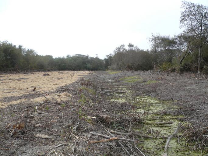 Keywords: SaltRiverCurrentChannel.jpg en A view of the cleared area awaiting excavation and the remaining small channel of the Salt River Humboldt County California View is looking West The chipped stray on the cleared area is mandated to prevent erosion During construction this entire width will be excavated own Ellin Beltz 2013-10-19 Salt River California Photographs by Ellin Beltz |