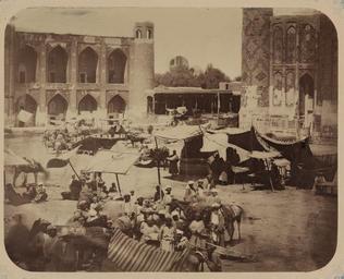 | Keywords: Samarkand Bazaar and Its Types of Vendors. Market Square between Three Madrasahs (Registan) WDL10867.png Artwork ru Кун Александ Людвигович 1840 1888 гг fr Kun Aleksandr L 1840-1888 en Kun Aleksandr L 1840-1888 zh 亚历山大·L· ,1840-1888 年 pt Kun Aleksandr L 1840-1888 ar كُن، ألكسندر ل ، 1840-1888 es Kun Aleksandr L 1840-1888 ru Сама кандский база и типы то говцев База ная площадь между т ех мед есе Реджистан fr Bazar de Samarcande et ses types de vendeurs Place du marché au centre de trois madrasas Registan en Samarkand Bazaar and Its Types of Vendors Market Square between Three Madrasahs Registan zh 撒马尔罕集市及各类商贩 三 伊斯兰教学校之间的集市广 (列吉斯 广 ) pt Bazar em Samarcanda e seus tipos de vendedores Praça do mercado entre três madrassas Registan ar بازار سمرقند وأنواع الباعة به ساحة السوق الواقعة بين ثلاث مدارس ريجستان ru Эта фотог афия входит в этног афическую часть <em> Ту кестанского альбома </em><em></em> всесто оннего исследования Цент альной Азии п едп инятого после того как в 1860-х годах в егионе установилось господство Российской импе ии Альбом созданный по аспо яжению гене ала Константина Пет овича фон Кауфмана 1818 1882 годы пе вого гене ал-губе нато а оссийского Ту кестана состоит из четы ех частей в шести томах «Часть а хеологическая» два тома «Часть этног афическая» два тома «Часть п омысловая» один том и «Часть исто ическая» один том Основным составителем альбома был оссийский востоковед Александ Людвигович Кун аботавший совместно с иколаем Венедиктовичем Богаевским В альбоме п едставлено около 1200 фотог афий а также а хитекту ные планы аква ельные исунки и ка ты «Часть этног афическая» включает в себя 491отдельную фотог афию на 163 листах а фотог афиях изоб ажены п едставители азличных на одов егиона листы 1 33 повседневная жизнь и итуалы листы 34 91 а также виды де евень и го одов уличные то говцы и комме ческая деятельность листы 92 163 <br>База ы; Этног афические фотог афии; ед есе; Рынки; То говцы; П одавцы; Фотог афические исследования; Площади fr Cette photographie est extraite de la partie ethnographique de l'<em>Album du Turkestan</em> étude visuelle complète de l'Asie centrale entreprise après que l'Empire russe prit le contrôle de la région dans les années 1860 Commandé par le général Konstantin Petrovich von Kaufman 1818 1882 premier gouverneur général du Turkestan russe l'album est composé de six volumes en quatre parties la partie archéologique deux volumes la partie ethnologique deux volumes la partie sur les métiers un volume et la partie historique un volume L'album fut essentiellement compilé par l'orientaliste russe Aleksandr L Kun assisté de Nikolai V Bogaevskii Il comporte près de 1200 photographies et inclut également des plans architecturaux des dessins à l'aquarelle et des cartes La partie ethnographique compte 491 photographies sur 163 planches montrant des individus des différentes peuplades de la région planches 1 à 33 des scènes de la vie quotidienne et des rites planches 34 à 91 ainsi que des vues de villages et de villes de vendeurs ambulants et d'activités commerciales planches 92 à 163 <br>Bazars; Photographies ethnographiques; Madrasas; Marchés; Marchands; Marchands ambulants; Inventaires photographiques; Places en This photograph is from the ethnographical part of <em>Turkestan Album</em><em> </em>a comprehensive visual survey of Central Asia undertaken after imperial Russia assumed control of the region in the 1860s Commissioned by General Konstantin Petrovich von Kaufman 1818 82 the first governor-general of Russian Turkestan the album is in four parts spanning six volumes Archaeological Part two volumes ; Ethnographic Part two volumes ; Trades Part one volume ; and Historical Part one volume The principal compiler was Russian Orientalist Aleksandr L Kun who was assisted by Nikolai V Bogaevskii The album contains some 1 200 photographs along with architectural plans watercolor drawings and maps The Ethnographic Part includes 491 individual photographs on 163 plates The photographs show individuals representing the different peoples of the region Plates 1 33 ; daily life and rituals Plates 34 91 ; and views of villages and cities street vendors and commercial activities Plates 92 163 <br>Bazaars; Ethnographic photographs; Madrasahs; Markets; Merchants; Peddlers; Photographic surveys; Plazas zh 这张照片出自<em> 其斯 相册 </em>的民族部分,该相册是俄罗斯 国 19 世纪 60 年代取得中亚控制 后, 手制 的 部针对该 区的综合 图像调查记录 相册由俄罗斯驻 其斯 (俄罗斯 国中亚属 的名称)首任 康斯 丁·彼得罗维奇·凡· 夫曼(Konstantin Petrovich von Kaufman,1818 82 年)将军赞助完成,共分六卷,四个部分: 古部分 (两卷); 民族部分 (两卷); 贸易部分 ( 卷)和 历史部分 ( 卷) 相册的主要编纂人是俄罗斯 方