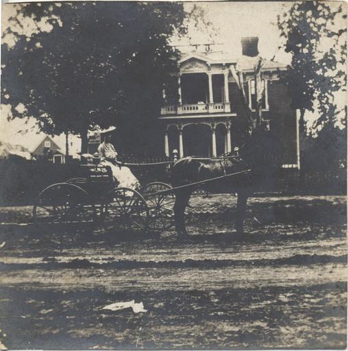 Keywords: Lala Williams Long driving horse, in front of Maxey house, c. 1895