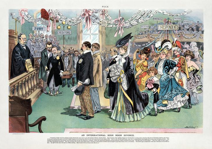 | Keywords: Samuel D. Ehrhart - An International High Noon Divorce (1906).jpg Anna Gould seen holding a bouquet made out of of indictment against her husband against Boni de Castellane See full text under Inscriptions burlesque du divorce d'Anna Gould et Boni de Castellane en 1906 Published N Y J Ottmann Lith Co Puck Bldg 1906 February 28 1 photomechanical print offset color Institution LOC object history exhibition history credit line File Samuel D Ehrhart - An International High Noon Divorce 1906 jpg - Restoration JPEG File Samuel D Ehrhart - An International High Noon Divorce 1906 png - Restoration PNG File Samuel D Ehrhart - An International High Noon Divorce 1906 - Original scan tif - Original scan TIFF LOC-image ppmsca 26038 AN INTERNATIONAL HIGH NOON DIVORCE Promptly at high noon the unhappy couple entered the court room to the soft strains of Hymn Twenty-three The American wife looking happy for the first time in many years leaned on the arm of the family solicitor; she wore a lovely green going-away gown and bore a huge bouquet of incriminating affidavits; her train was carried by her minor child Next in the divorce procession came the co-respondents charmingly and in some cases daringly gowned The husband was supported by his counsel and swooned twice during the separation ceremony which was performed beneath a monster floral ax while a surpliced jury sang My Boni Lies Over the Ocean How Can I Bear to Leave Thee and other appropriate selections After the ceremony the former wife's father gave a luncheon to the Count's creditors and arranged to pay them thirty cents on the dollar The Count's gift to his former wife was a statement of his debts to date Her gift to him was a tin can in a Tiffany setting Miss Creesis will be at home after March 15 PUCK Top J OTTMANN LITH CO PUCK BLDG N Y Small text lower left just under image Text on cartoon itself not listed Tweaks made lines spots and other damage removed cropped text straightened a bit had a couple funny curves that are likely bulges in the paper levels adjusted Image and text for whatever reason didn't match alignments that well so I tweaked the relative rotations a little bit accession number LC-DIG-ppmsca-26038 Call Number Illus in AP101 P7 1906 Case X P P Assessments 1 An International High Noon Divorce 1 Samuel D Ehrhart - An International High Noon Divorce 1906 jpg/2 PD-100 Images of Paris from the Library of Congress Samuel D Ehrhart Anna Gould Boni de Castellane 1906 in Paris Marriage in Paris Courthouses in Paris Divorce in art Fashion in 1906 Adam Cuerden's restorations Featured pictures of Paris |