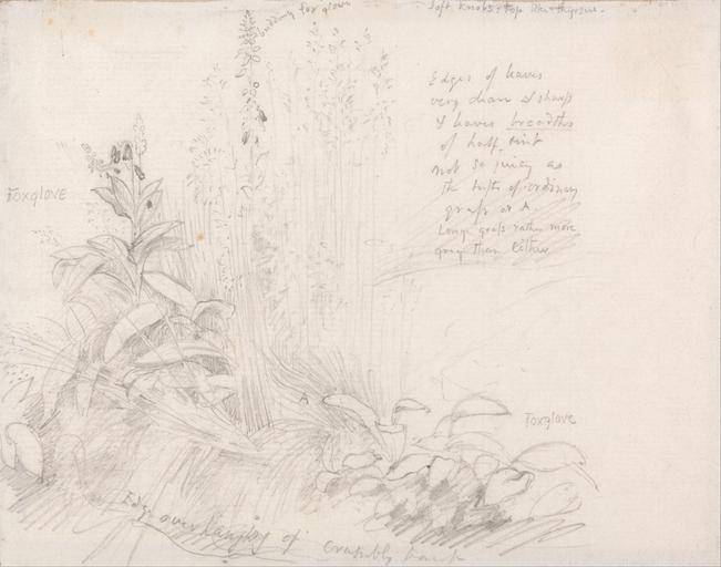 Keywords: Samuel Palmer - Foxgloves - Google Art Project.jpg Inscribed in artist's hand in graphite upper center budding fox glove ; in artist's hand in graphite upper right Soft knobs Top like thyrsus ; in artist's hand in graphite center left Foxglove ; in artist's hand in graphite center right Edges of leaves very clean sharp and leaves breadths of half tint no so juicy as the tufts of ordinary grass at A Long grass rather more grey than either ; in artist's hand lower center Edge overhanging of crumbly tank ; in artist's hand in graphite lower right Foxglove ; inscribed on back in graphite center Fox Glove 1678 With Grasses Toys Hill July 55 Inscription _Signed_and_Dated Not signed not dated Not on View Graphite on medium smooth white laid paper foxgloves flowers sketch still life special url_id KwELEGyxoACAEg PD-old-100-1923 1881 Drawings by Samuel Palmer Google Art Project works by Samuel Palmer |