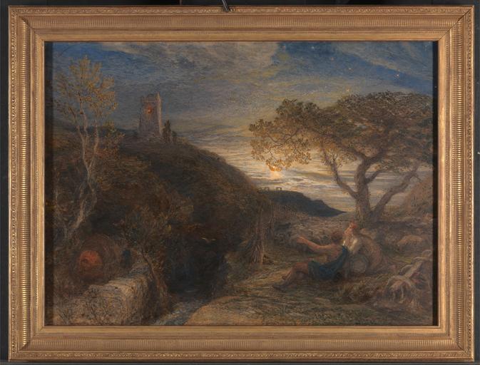 Keywords: Samuel Palmer - The Lonely Tower - Google Art Project.jpg Inscribed in artist's hand on label on back in pen and brown ink center left No 1 The Lonely Tower Or let my lamp at midnight hour Be seen in some high lonely tower Where I may oft outwatch the Bear With thice great Hermes Samuel Palmer Inscription _Signed_and_Dated Not signed not dated Not on View Watercolor gouache and gum arabic on London board a high-quality pasteboard sheet made of Whatman's finest drawing paper roots sunset sheep Milton John 1608 “1674 poet and polemicist light stars time Classical prehistoric shepherd shepherd stones tower building division cave trees standing stones figures landscape poem special url_id lgFQJBSDZx1QHg PD-old-100-1923 1881 Watercolor paintings by Samuel Palmer Google Art Project works by Samuel Palmer