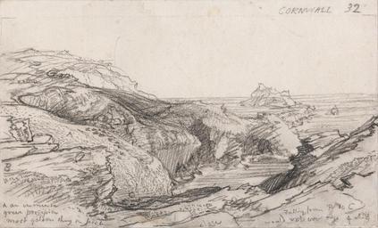 | Keywords: Samuel Palmer - A Page from a Cornish Sketchbook- Cornwall 32 - Google Art Project.jpg Inscribed in artist's hand in graphite upper right Cornwall 32 ; in artist's hand in black chalk center left B A C ; in artist's hand in graphite lower left A an immense green precipice most golden thing in picture ; in artist's hand in black chalk lower center close ; in artist's hand in black chalk lower right Falling from B to C would roll over edge of cliff Inscription _Signed_and_Dated Not signed not dated Not on View Graphite on medium smooth white wove paper pages beach coast landscape sketchbook special url_id zQGtQsP61aQYew PD-old-100-1923 1881 Drawings by Samuel Palmer Google Art Project works by Samuel Palmer Coasts of Cornwall in art |