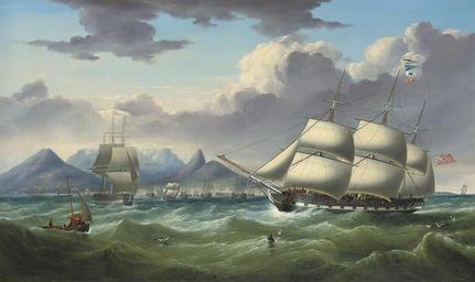 Keywords: Samuel Walters - merchantman Duke of Lancaster.jpg ca 1832 oil canvas cm 71 2 118 2 object history credit line signed 'Walters' lower right The full-rigged ship žDuke of Lancaster was built at Liverpool in 1820 and operated by one of that city's most prominent ship-owners Mr John Gladstone Measured at 565 tons she was quite a large vessel for her day and drew 19 feet of water when fully laden She was also stoutly built with iron knees and proved iron cables as well as having a copper-sheathed hull Under her first master Captain Morrison she was employed in the Calcutta trade and continued thus albeit with some later trips to Bombay under Captain Hargraves for the rest of her career until disappearing from record in 1844 <br/> žRoyal Saxon 510 tons and another Liverpool ship was built in the city in 1829 and owned by Kendall Co From the outset under her first master Captain Renner she traded to Batavia Java and continued on this route under her new master Captain Black after 1834 Around 1840 after she had been sold to owns of London she altered her regular run to Port Phillip Australia and thereafter Sydney before disappearing from record in 1844 <br/> Given that both the principal vessels portrayed here are unrecorded after 1844 - a remarkable coincidence - and Royal Saxon passed into the fleet of a London owner in 1840 it is almost certain that this work would have been painted during the 1830s <ref>http //www christies com/lotfinder/LotDetailsPrintable aspx intObjectID 5259448 christies com</ref> reflist accession number Christie's online 5259448 PD-old-100 Samuel Walters 19th-century sailing ships in paintings Duke of Lancaster ship 1820 Cape of Good Hope 1830s paintings