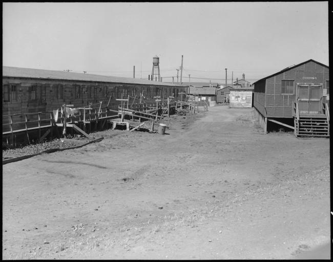 | Keywords: San Bruno, California. Another view of barracks at the Tanforan Assembly center, after approximatel . . . - NARA - 537920.jpg Scope and content The full caption for this photograph reads San Bruno California Another view of barracks at the Tanforan Assembly center after approximately six weeks of occupancy The building on the right is one of the eighteen such mess halls which together accomodate approximately 8 000 persons for three meals each day General notes 537920 Local identifier 210-G-C620 Department of the Interior War Relocation Authority 02/16/1944 - 06/30/1946 NARA-Author Lange Dorothea 1895-1965 Photographer 1372774 <br /> Still Picture Records Section Special Media Archives Services Division NWCS-S National Archives at College Park 8601 Adelphi Road College Park MD 20740-6001 1942-06-16 Record group Record Group 210 Records of the War Relocation Authority 1941 - 1989 Record group ARC 537 Central Photographic File of the War Relocation Authority compiled 1942 - 1945 Series ARC 536000 File unit File unit ARC Variant control numbers NAIL Control Number NWDNS-210-G-C620 Other versions <gallery> File San_Bruno _California _Another_view_of_barracks_at_the_Tanforan_Assembly_center _after_approximatel_ _ _ _-_NARA_-_537920 tif tif File San_Bruno _California _Another_view_of_barracks_at_the_Tanforan_Assembly_center _after_approximatel_ _ _ _-_NARA_-_537920 jpg jpg </gallery> NARA-cooperation PD-USGov Tanforan Assembly Center Barracks in California JA internment Tanforan Mess halls NARA images of San Mateo County California JA internment Dorothea Lange JA internment Tanforan Black and white photographs of California Tanforan |