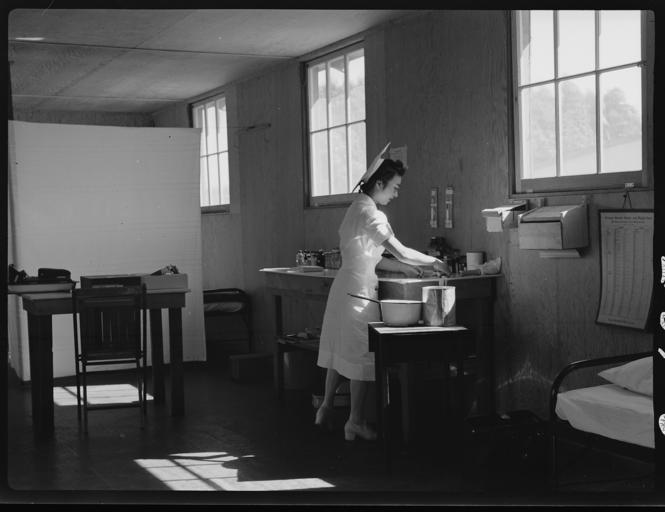 | Keywords: San Bruno, California. An evacuee nurse of Japanese ancestry tidying up after a busy morning in the . . . - NARA - 537935.jpg Scope and content The full caption for this photograph reads San Bruno California An evacuee nurse of Japanese ancestry tidying up after a busy morning in the medical clinic at this assembly center General notes 537935 Local identifier 210-G-C635 Department of the Interior War Relocation Authority 02/16/1944 - 06/30/1946 NARA-Author Lange Dorothea 1895-1965 Photographer 1372774 <br /> Still Picture Records Section Special Media Archives Services Division NWCS-S National Archives at College Park 8601 Adelphi Road College Park MD 20740-6001 1942-06-16 Record group Record Group 210 Records of the War Relocation Authority 1941 - 1989 Record group ARC 537 Central Photographic File of the War Relocation Authority compiled 1942 - 1945 Series ARC 536000 File unit File unit ARC Variant control numbers NAIL Control Number NWDNS-210-G-C635 Other versions <gallery> File San_Bruno _California _An_evacuee_nurse_of_Japanese_ancestry_tidying_up_after_a_busy_morning_in_the_ _ _ _-_NARA_-_537935 tif tif File San_Bruno _California _An_evacuee_nurse_of_Japanese_ancestry_tidying_up_after_a_busy_morning_in_the_ _ _ _-_NARA_-_537935 jpg jpg </gallery> NARA-cooperation PD-USGov Dorothea Lange Tanforan Assembly Center |
