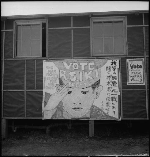 | Keywords: San Bruno, California. Buildings of the Tanforan Center are plastered at this time with all manner . . . - NARA - 537902.jpg Scope and content The full caption for this photograph reads San Bruno California Buildings of the Tanforan Center are plastered at this time with all manner of locally devised posters incident to the election of five each of the five precincts General notes 537902 Local identifier 210-G-C597 Department of the Interior War Relocation Authority 02/16/1944 - 06/30/1946 NARA-Author Lange Dorothea 1895-1965 Photographer 1372774 <br /> Still Picture Records Section Special Media Archives Services Division NWCS-S National Archives at College Park 8601 Adelphi Road College Park MD 20740-6001 1942-06-16 Record group Record Group 210 Records of the War Relocation Authority 1941 - 1989 Record group ARC 537 Central Photographic File of the War Relocation Authority compiled 1942 - 1945 Series ARC 536000 File unit File unit ARC Variant control numbers NAIL Control Number NWDNS-210-G-C597 Other versions <gallery> File San_Bruno _California _Buildings_of_the_Tanforan_Center_are_plastered_at_this_time_with_all_manner_ _ _ _-_NARA_-_537902 tif tif File San_Bruno _California _Buildings_of_the_Tanforan_Center_are_plastered_at_this_time_with_all_manner_ _ _ _-_NARA_-_537902 jpg jpg </gallery> NARA-cooperation PD-USGov Dorothea Lange Tanforan Assembly Center June 1942 in the United States |