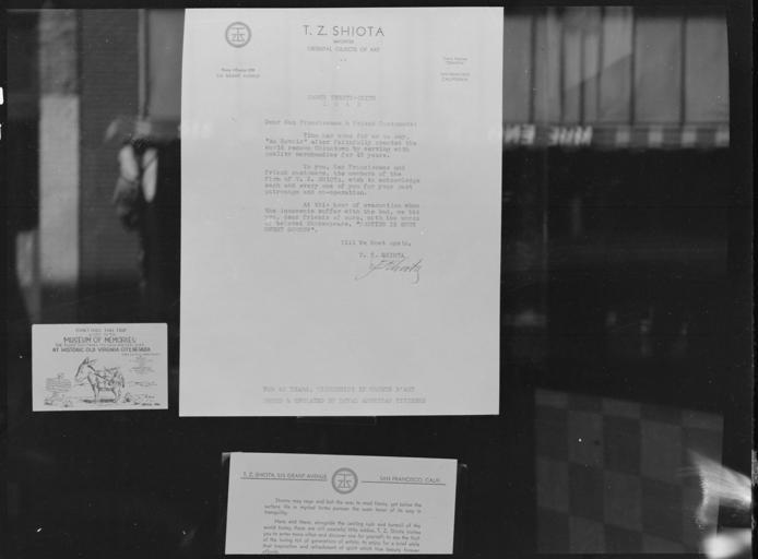 MAKE A MEME View Large Image San Francisco, California. Farewell letter posted in show window of T.Z. Shiota, importer in San Fr . . . - NARA - 536414.jpg Scope and content The full caption for this photograph reads San Francisco California Farewell letter posted in ...