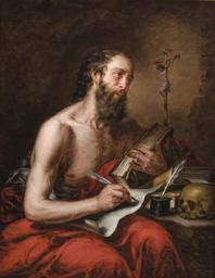 Keywords: San Jerónimo escribiendo la Vulgata, de José Gutiérrez de la Vega (Museo de Bellas Artes de Sevilla).jpg La obra representa a San Jerónimo de Estridón que es uno de los Padres de la Iglesia escribiendo la Vulgata que es la versión latina de las Sagradas Escrituras Y el santo aparece semidesnudo con una barba larga grisácea y ante un crucifijo y una cráneo colocacos sobre una mesa al tiempo que en su mano izquierda mientras escribe con la derecha sujete la Santa Biblia Siglo XIX oil on canvas Size cm 79 100 Institution Museo de Bellas Artes Seville http //ceres mcu es/pages/Main accession number CE0495P http //ceres mcu es/pages/Main PD-old-100 Paintings of Saint Jerome in Spain 19th-century paintings of Saint Jerome Paintings of Saint Jerome with skull Paintings by José Gutiérrez de la Vega 19th-century paintings in the Fine Arts Museum of Seville |