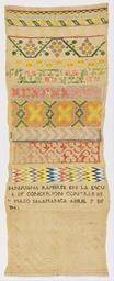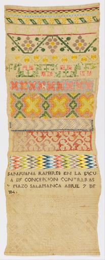 Keywords: San Juana Ramires - Sampler - Google Art Project.jpg San 6851363 Juana Ramires /collection/cooper-hewitt-national-design-museum/artwork/sampler-san-juana-ramires/6818782/ 177041 San Juana Ramires /artist/san-juana-ramires/12690421/ 12690421 /collection/cooper-hewitt-national-design-museum/ Cooper-Hewitt National Design Museum 3644669 http //www cooperhewitt org/ /collection/cooper-hewitt-national-design-museum/artwork/sampler-san-juana-ramires/6818782/ 1848 1848 Medium silk and cotton embroidery on cotton foundationTechnique embroidered in satin cross long-armed cross and double running stitches on plain weave foundation 945 6818782 False 1848 1981-28-427 http //collection cooperhewitt org/view/objects/asitem/id/177041 Bequest of Gertrude M Oppenheimer Sampler 1840 1850 w350 x h945 cm 1848 False 0 404296875 Object sampler-san-juana-ramires Sampler s 350 H x W 94 x 35 6 cm 37 x 14 in San Juana Ramires en la esuela de Concepcion Contreras y Mazo Salamanca Abril 7 de 1848 Medium silk and cotton embroidery on cotton foundationTechnique embroidered in satin cross long-armed cross and double running stitches on plain weave foundation special url_id PAFKk9mu7gciOQ PD-old-70-1923 Google Art Project works by San Juana Ramires Textiles in the Cooper “Hewitt Smithsonian Design Museum 1840s samplers Google Art Project works in Cooper-Hewitt Smithsonian Design Museum 1848 works |