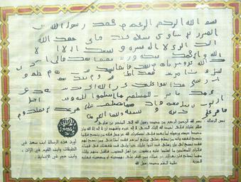 Keywords: Sana' military museum 07.JPG en A facsimile of a letter of the prophet Muhammed to Munzir ibn Sawa Al Tamimi Below the facsimile reproduction is a modern transcription ar بعض الآثار القديمة في المتحف الحربي اليمني بصنعاء On display at the military museum of Yemen in Sana'a own photograph Email4mobile 2010-02-08 photograph File Muhammad Bahrain letter facsimile png Yemen Military Museum Manuscript letters written messages History of Muhammad Arabic texts |
