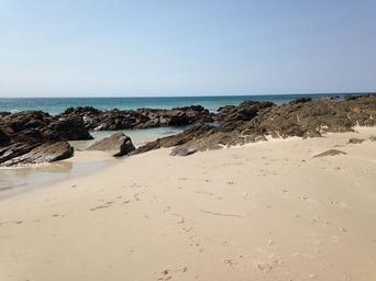 Keywords: sandy beach seaside blue sky white sand nature paradise ocean sea waves holiday pebble rocks shells stones algae tide storm wild coast tropical island romantic mountains hills white clouds lande seascape maritime tourism relaxation rest deserted beach landscape horizon