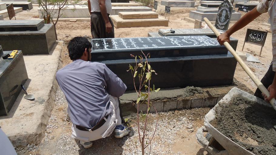 Keywords: Sange Qabr.JPG en Arabic Headstone fa یک سنگ قبر در حال نصب own Elph 2011-07-20 cc-by-sa-3 0 GFDL Gravestones