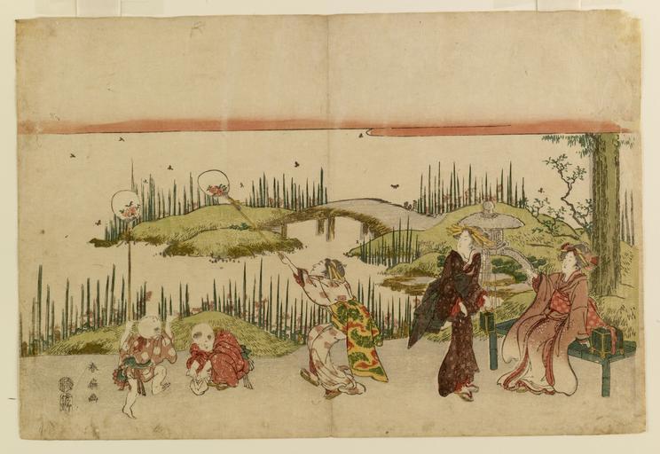 Keywords: Sanoki - Women and Children Catching Fireflies - Walters 95170.jpg Ladies in elegant kimonos and elaborate coiffures enjoy themselves catching fireflies with their children in the Kenrokuen Garden in Kanazawa The color and fluidity of movement of the five small figures arrayed across the foreground set them apart from the plain stylized landscape The Kenrokuen Garden can still be visited today; the decorative lantern on the right adorns the same bridge after 200 years between 1806 1830 Edo pigments mulberry paper cm 26 38 3 accession number 95 170 11673 Justine Lewis Keidel date and mode of acquisition unknown Walters Art Museum Gift of Justine Lewis Keidel 1986 Signature Shunsen ga place of origin Japan Walters Art Museum license 2D Japanese prints in the Walters Art Museum Historic samurai prints Media contributed by the Walters Art Museum needs category review Katsukawa Shunsen |