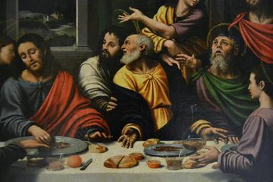 Keywords: Sant Sopar (detall) de Joan de Joanes, Museu de Belles Arts de València.JPG La obra muestra a Jesucristo y a sus doce apóstoles cenando en la víspera de la pasión y muerte del Salvador ca Sant Sopar detall de Joan de Joanes oli sobre taula Museu de Belles Arts de València Joan de Joanes va pintar des de molt jove en col·laboració amb son pare i aquesta és la primera obra de la qual consta que és un treball exclusivament seu Va pertànyer al retaule que els argenters de València van dedicar al seu patró sant Eloi a la parròquia de santa Caterina El pintor tradueix en imatges el moment en què Crist anuncia als seus deixebles que un d'ells el trairà mereix especial atenció el tractament naturalista dels elements del bodegó Siglo XVI oil on panel Size cm 84 92 Institution Museo de Bellas Artes de Valencia http //museobellasartesvalencia gva es/index php option com_content view article id 603 3Asanta-cena catid 54 3Arenacimiento-pleno Itemid 80 lang es object history exhibition history credit line accession number 305 own PD-old-100 cc-by-sa-3 0 Santa Cena de Joan de Joanes Museu de Belles Arts de València |