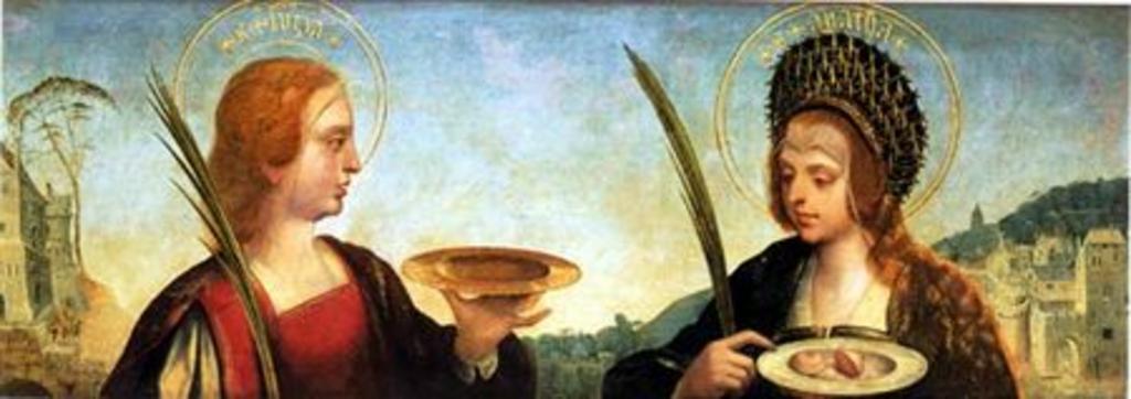 Keywords: Santa Luzia e Santa Ágata.jpg pt Este quadro bem como Santa Margarida e Santa Maria Madalena Museu Nacional de Arte Antiga provem da ermida lisboeta do Paraíso Duas outras pinturas que hoje se encontram no Museu de Posen na Polónia Santa Apolónia e Santa Inês e Santa Catarina e Santa Bárbara com idêntico formato e composição foram compradas em Lisboa no ano de 1844 pelo Conde Atanazy Raczynski tendo pertencido à Galeria do Marquês de Penalva Carl Justi atribuíu este conjunto a Velascus e José de Figueiredo aludindo às pinturas de Posen menciona o nome de Cristóvão de Figueiredo Luís Reis-Santos lançou a hipótese de as quatro pinturas terem constituído as predelas do retábulo do Paraíso Museu Nacional de Arte Antiga atribuído a Gregório Lopes Vítor Serrão in catálogo da exposição No Tempo das Feitorias subscreve a opinião de Reis-Santos integrando-os na obra de Gregório Lopes 2013-01-08 23 45 34 IGESPAR Creator Gregório Lopes PD-old-100 Uploaded with UploadWizard Gregório Lopes Paintings of Saint Lucy Paintings of Saint Agatha of Sicily |