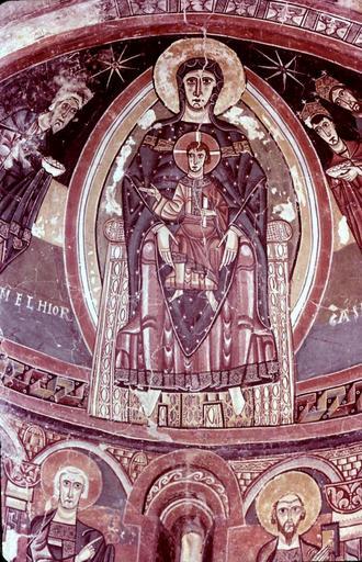 Keywords: Santa María de Tahull.jpg master of Santa Maria de Taüll Absis de Santa Maria de Taüll detall Apse of Santa Maria de Taüll detail ca 1123 frescocanvas Institution Museu Nacional d'Art de Catalunya Barcelona accession number 015863-000 object history credit line Es una virgen trono o theothronos en el ábside de la Iglesia de Santa María de Tahull rodeada de una mandorla en rojo y ocre Representa la Epifanía símbolo de la fundación de la Iglesia con Cristo en su seno y sin la visión de dios juzgador típica de la época es un niño con un pergamino en una mano y bendiciendo con la otra Vemos a su alrededor a los Tres Reyes Magos con las inscripciones de sus nombres con la curiosidad de que son todos blancos own ETSAM PD-Art Frescos of Santa Maria de Taüll |