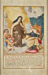 Keywords: Santa Teresa de Jesus e o Duque de Bragança (séc. XVII-XVIII).png pt Pintura de Santa Teresa de Jesus entregando um ceptro a D João IV de Portugal Lê-se na legenda Na Era de 1639 um ano antes da Aclamação deste Reino teve esta visão a Venerável Serva de Deus Leonor Rodrigues na qual viu o Duque de Bragança sentado em um Trono Real e a Santa Teresa que com a mão esquerda lhe metia um ceptro na mão; e deu-se a entender a esta Serva de Deus que dali a um ano teriam os Portugueses Rei natural por intercessão da Santa e por estar a sua mão esquerda em Portugal; por isso com esta mão lhe punha o ceptro e não com a direita Assim se cumpriu no ano seguinte de 1640 en Painting of Saint Theresa offering a sceptre to King John IV at the time Duke of Braganza The text reads On the Year of 1639 one year before the Acclamation of this Kingdom the Venerable Servant of God Leonor Rodrigues had this vision in which she saw the Duke of Braganza sitting on a Royal Throne and Saint Thereza putting a sceptre on his hands with her left hand; the Servant of God understood that within a year the Portuguese would have their natural King by the Saint's intercession and because her left hand is in Portugal; it was for this reason that she offered him the sceptre with his left hand and not the right This came to pass in 1640 the year that followed century 17 https //www pcv pt/lot php ID 6824 ref search pic sid 19f5976005e78df685cdd82c4d4a2374 Palácio do Correio Velho author other versions Custom license marker 2016 11 28 PD-old-100 1639 in Portugal Visions of christian saints Saint Teresa of Ávila John IV of Portugal Cherubs |