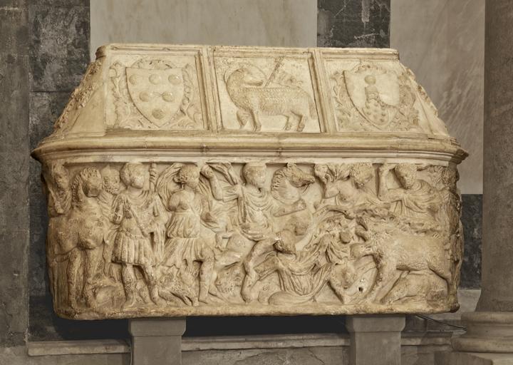 | Keywords: Sarcophage Baptistère Florence.jpg Baptistère de Florence La cuve est romaine elle représente une chasse au sanglier Le couvercle date du moyen-âge et porte les anciennes armes des Médicis ainsi que l'Agneau de Dieu Utilisé pour la sépulture de Guccio de' Medici gonfalonier de la ville de Florence en 1299 Florence Baptistery an ancient roman sarcophagus representing a boar hunting The cover is medieval with reliefs of the ancient CoA of the Medici family and the Agnus Dei This sarcophagus was used for the burial of Guccio de' Medici gonfaloniere of the city in 1299 2011-06-02 own Jebulon 43 46 23 2 N 11 15 18 1 E Usual level improvements Decreasing of light and contrast around the main subject With GIMP cc-zero QualityImage Uploaded with UploadWizard Ancient Roman sarcophagi in Florence Ancient Roman reliefs in Florence Interior of the Florence Baptistry Reliefs of coats of arms of the House of Medici in Florence Reliefs of hunting in Italy Boar hunting in art Reliefs of the Agnus Dei in Italy Quality images by Jebulon |