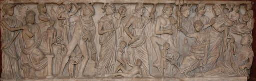 Keywords: Sarcophagus Prometheus Louvre Ma339.jpg Prometheus creates Man; some Olympian gods watch the process from left to right Athena with her helmet Hermes with his winged petasus and cloak two Moirae probably Lachesis and Clotho Poseidon with his trident Artemis with the moon crescent and presumably Atropos Roman sarcophagus ca 240 AD Création de l'homme par Prométhée Parmi les personnages on peut reconnaître de gauche à droite Athéna casquée Hermès et son pétase ailé deux Moires probablement Lachésis et Clotho Poséidon et son trident Artémis au croissant de lune et probablement Atropos Sarcophage romain v 240 ap J -C H 71 cm 27 ¾ in W 221 cm 7 ft 3 in 61 cm 24 in Museum Louvre Department of Greek Etruscan and Roman Antiquities Denon wing ground floor room 27 object history credit line Gift of the city of Arles Provence France accession number Ma 339 LL 309 Jastrow 2006 other versions 3rd-century sarcophagi Louvre Ancient Roman sarcophagi in the Louvre Roman antiquities in the Louvre - Room 27 Reliefs of Artemis Reliefs of Athena Reliefs of Hermes Reliefs of Poseidon Prometheus Lachesis mythology Clotho mythology |