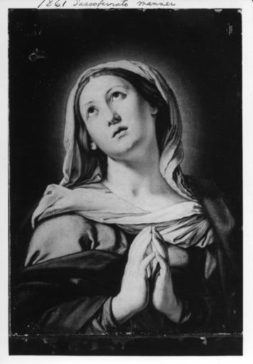 Keywords: Sassoferrato - The Virgin In Prayer - Walters 371861.jpg The Virgin's simple garments and unadorned hair indicate her humility and the halo of light radiating from her head testifies to her sanctity and purity The regular shapes of the Virgin's features and the upturned gaze reveal Sassoferrato's study of the work of Guido Reni 1575-1642 Sassoferrato however uses more simplified forms than Reni as well as a reduced color scheme This simplicity of style was intended to convey piety Some of the artist's renderings of the subject were meant as pendants or companion paintings to images of Christ as the Savior of the World Salvator Mundi following a northern European type Zeri Italian paintings in the Walters Art Gallery 323 450-451 1630-80 Baroque Oil on canvas Painted surface cm 61 8 45 4 ; Framed cm 81 28 68 58 3 81 accession number 37 1861 15971 Agostini Family Sassoferrato date and mode of acquisition unknown Don Marcello Massarenti Collection Rome date and mode of acquisition unkonwn 1881 catalogue no 144 1897 catalogue no 255 Henry Walters city Baltimore Walters Art Museum Henry Walters Acquired by Henry Walters with the Massarenti Collection 1902 place of origin Rome Italy Walters Art Museum license 2D Baroque paintings in the Walters Art Museum Il Sassoferrato Media contributed by the Walters Art Museum needs category review |