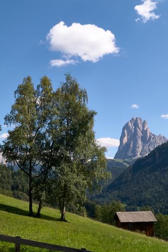 Keywords: sassolungo val gardena trees barn landscape mountains nature hut meadow grass heustadel dolomites