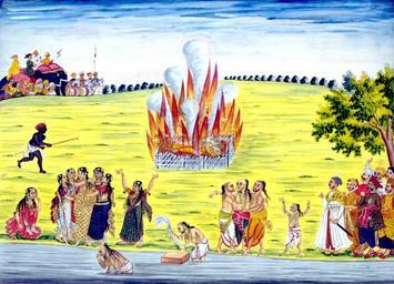 Keywords: Sati ceremony.jpg en The pictures made by Indian artists for the British in India are called Company paintings This one depicts the practice of sati suttee or widow-burning The word is the Sanskrit for 'good woman' or 'true wife' It was applied to the Hindu widow who makes the supreme sacrifice by following her husband onto the funeral pyre Although suppressed in the 19th century isolated instances of sati still occur in India even today circa 1800 painted ca 1800 made http //collections vam ac uk/item/O15842/painting-sati-ceremony/ Unknown production PD-old-100 Uploaded with UploadWizard Sati Company style Art of India in the Victoria and Albert Museum |