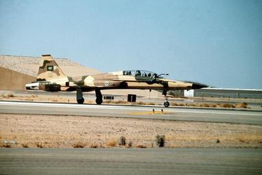 Keywords: Saudi Tiger.JPEG An F-5F Tiger II fighter aircraft of the 3rd Squadron Royal Saudi Air Force takes off during Operation Desert Shield http //www defenseimagery mil/imagery html a search s Royal 20Saudi 20Air 20Force n 90 guid 7c466df3f18266b893c56d2d0c98b950831d03fb 4/1/1992 Tech Sgt Rose S Reynolds PD-USGov Aircraft of the Royal Saudi Air Force F-5 Tiger II