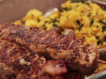 Keywords: sausage bratwurst food eat grill sausage delicious sizzle egg omelette meat grilled meats herbs party brunch