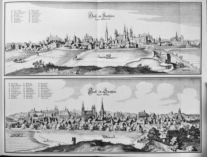Keywords: Saxoniae Inferioris (Merian) b 015.jpg Artwork creator Matthäus Merian Halle Saale Sachsen-Anhalt Deutschland Oben von Süden; Unten von Norden b 1653 copper engraving object history exhibition history credit line de de accession number Topographia Saxoniae Inferioris Frankfurt am Main 1653 PD-100 Engravings of Topographia Saxoniae Inferioris Historic views of Halle Saale Topographia Saxoniae Inferioris Merian |