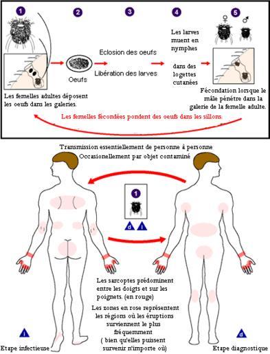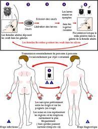 Keywords: Scabies LifeCycle(French version).GIF Scabies Arthropod Sarcoptes traduction en français des légendes de l'image suivante Scabies_LifeCycle GIF Sarcoptes scabei undergoes four stages in its life cycle; egg larva nymph and adult Females deposit eggs at 2 to 3 day intervals as they burrow through the skin Eggs are oval and 0 1 to 0 15 mm in length and incubation time is 3 to 8 days After the eggs hatch the larvae migrate to the skin surface and burrow into the intact stratum corneum to construct almost invisible short burrows called molting pouches The larval stage which emerges from the eggs has only 3 pairs of legs and this form lasts 2 to 3 days After larvae molt the resulting nymphs have 4 pairs of legs This form molts into slightly larger nymphs before molting into adults Larvae and nymphs may often be found in molting pouches or in hair follicles and look similar to adults only smaller Adults are round sac-like eyeless mites Females are 0 3 to 0 4 mm long and 0 25 to 0 35 mm wide and males are slightly more than half that size Mating occurs after the nomadic male penetrates the molting pouch of the adult female Impregnated females extend their molting pouches into the characteristic serpentine burrows laying eggs in the process The impregnated females burrow into the skin and spend the remaining 2 months of their lives in tunnels under the surface of the skin Males are rarely seen They make a temporary gallery in the skin before mating Transmission occurs by the transfer of ovigerous females during personal contact Mode of transmission is primarily person to person contact but transmission may also occur via fomites e g bedding or clothing Mites are found predominantly between the fingers and on the wrists The mites hold onto the skin using suckers attached to the two most anterior pairs of legs http //www dpd cdc gov/dpdx/HTML/ImageLibrary/ Scabies_LifeCycle GIF centre for disease control gov PD-USGov PD-USGov-HHS-CDC PD-USGov Sarcoptidae CDC lifecycles Life cycles of parasitic Arachnida |