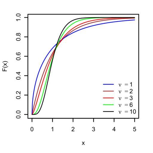 Keywords: Scaled chi squared cdf.svg sample variance s<sup>2</sup> <math>s 2 \frac \;\sigma 2 \nu \; \chi_\nu 2</math> where s<sup>2</sup> is the mean of the squares of independent normal distributions of mean 0 and standard deviation ; plotted here for the case 1 0 Equivalently this is also a plot of the c d f for the variance ratio s<sup>2</sup>/ <sup>2</sup> for any value of 2012-10-21 11 16 43 own Created in R using the code fragment below Jheald cc-zero See also File Scaled chi squared svg Created with R v CairoSVG scaled_chi_squared cdf svg width 3 height 3 pointsize 8 x <- seq 0 5 by 0 02 par mar c 5 4 2 2 + 0 1 plot x pchisq 2 x 2 ty 'l' col brown ylab F x lines x pchisq x 1 ty 'l' col blue lines x pchisq 3 x 3 ty 'l' col red lines x pchisq 6 x 6 ty 'l' col green lines x pchisq 10 x 10 ty 'l' col black legend bottomright legend expression nu 1 nu 2 nu 3 nu 6 nu 10 lty 1 col c blue brown red green black bty n dev off Uploaded with UploadWizard Chi-square distribution |