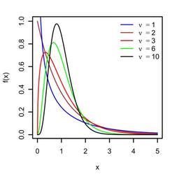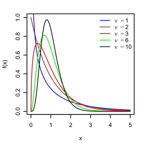 Keywords: Scaled chi squared.svg sample variance s<sup>2</sup> <math>s 2 \frac \;\sigma 2 \nu \; \chi_\nu 2</math> where s<sup>2</sup> is the mean of the squares of independent normal distributions of mean 0 and standard deviation ; plotted here for the case 1 0 Equivalently this is also a plot of the distribution of the variance ratio s<sup>2</sup>/ <sup>2</sup> for any value of As increases s<sup>2</sup>/ <sup>2</sup> becomes more sharply peaked close to 1 2012-10-21 10 43 59 own Created in R using the code fragment below Jheald Created with R v CairoSVG scaled_chi_squared svg width 3 height 3 pointsize 8 x <- seq 0 5 by 0 02 par mar c 5 4 2 2 + 0 1 plot x dchisq 2 x 2 2 ty 'l' col brown ylab f x lines x dchisq x 1 ty 'l' col blue lines x dchisq 3 x 3 3 ty 'l' col red lines x dchisq 6 x 6 6 ty 'l' col green lines x dchisq 10 x 10 10 ty 'l' col black legend topright legend expression nu 1 nu 2 nu 3 nu 6 nu 10 lty 1 col c blue brown red green black bty n dev off See also File Scaled chi squared cdf svg cc-zero Uploaded with UploadWizard Chi-square distribution |