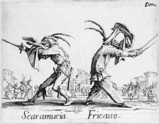 Keywords: Scaramucia, Fricasso - Gallica 2012 (adjusted).jpg Scaramucia Little Skirmisher and Fricasso Big Noise nom de guerre of Il Capitano characters of the commedia dell'arte etching print 7 2 x 8 1 cm Scaramucia Fricasso - Gallica 2012 png The image was cropped converted to grayscale light-levels adjusted and converted to jpg format quality level 10 with Photoshop Elements 10 draughtsman m / engraver m Creator Jacques Callot 1621 “1622 Scaramucia Fricasso - Gallica 2012 png PD-old-100 Scaramouche Il Capitano Balli di Sfessania |